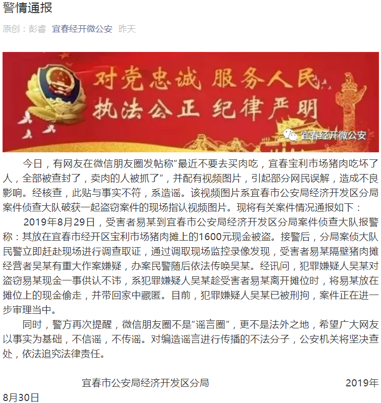 今日(8月30日),有网友在微信朋友圈发帖称“最近不要去买肉吃,宜春宝利市场猪肉吃坏了人,全部被查封了,卖肉的人被抓了”,并配有视频图片,引起部分网民误解,造成不良影响。经核查,此贴与事实不符,系造谣。该视频图片系宜春市公安局经济开发区分局案件侦查大队破获一起盗窃案件的现场指认视频图片。现将有关案件情况通报如下: