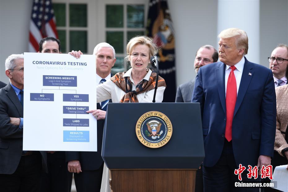 当地时间3月13日,美国总统特朗普在白宫宣布“国家紧急状态”,应对新冠肺炎疫情。图为白宫新冠肺炎疫情协调官德博拉·博克斯在发布会上介绍测试流程。 中新社记者 陈孟统 摄