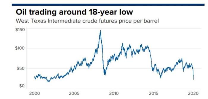 中新网客户端北京3月19日电 (张旭)新冠肺炎疫情持续抑制原油需求,加上投资者对全球经济衰退的担忧加剧。3月18日,国际油价继续暴跌,美国WTI原油期货收跌16.25%报22.89美元/桶,创近18年新低,盘中一度暴跌25%,跌近20美元/桶。布伦特原油期货收跌7.27%,报28.2美元/桶,盘中一度跌超13%,创2003年5月以来新低。本月,WTI和布伦特原油期货价格已累计跌超46%。高盛下调了第二季度油价预期,认为WTI和布伦特原油期货价格将降至平均20美元/桶。