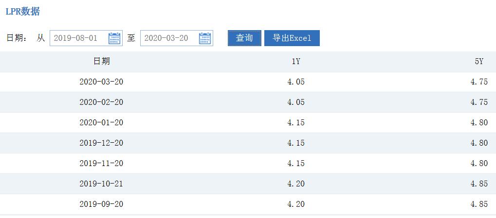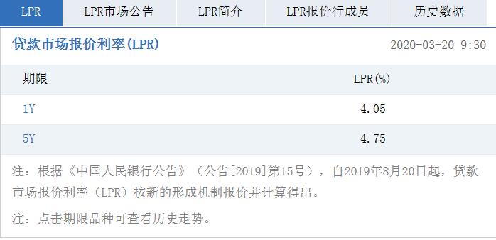 2020年3月20日,LPR第八次报价显示,1年期LPR为4.05%,5年期以上LPR为4.75%,均与此前持平。