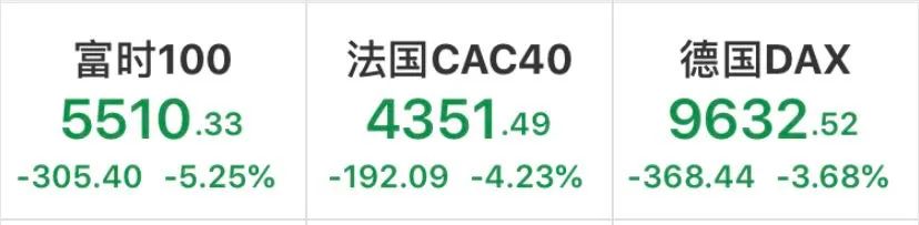 欧股主要股指大幅下跌,截至收盘,英国富时100指数跌5.25%。此前,因英国首相被确诊,富时100指数一度跌逾7%。德国DAX30指数跌3.68%,法国CAC40指数跌4.23%。