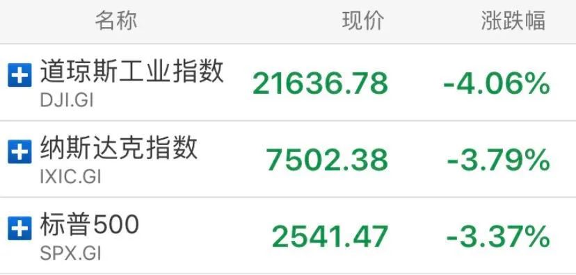 纳指下跌3.79%,报7502.38点;标普下跌3.37%,报2541.47点。