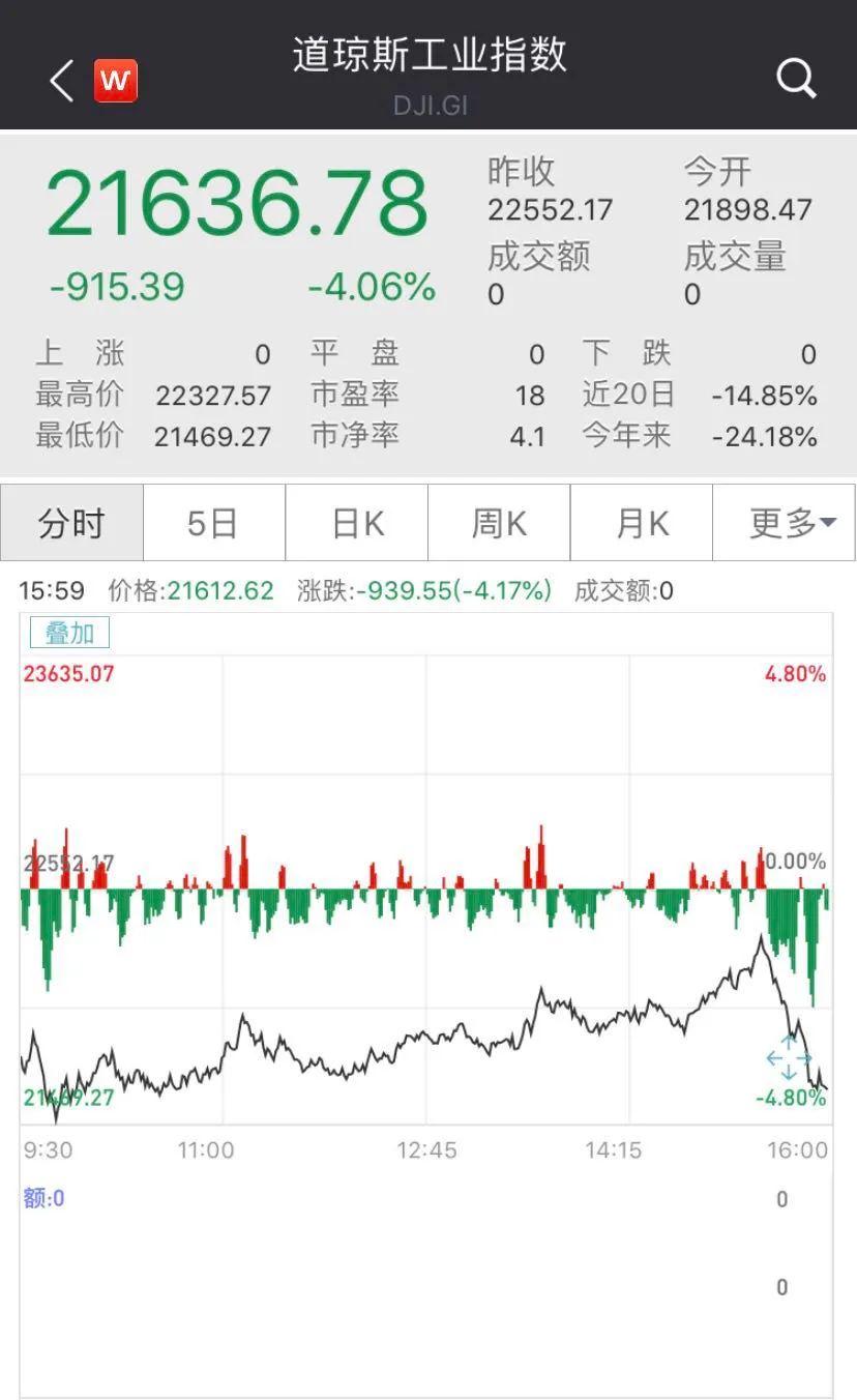 美东时间周五,美股三大指数集体下挫,截止收盘,道指下跌逾900点,尾盘跳水,跌幅为4.06%,结束三连涨。