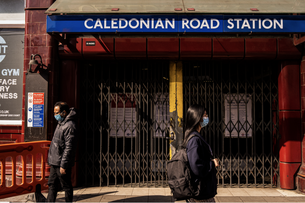 伦敦一座已关站的地铁站外,戴着口罩的行人正在经过。目前伦敦市内大多数地铁站已经关闭。