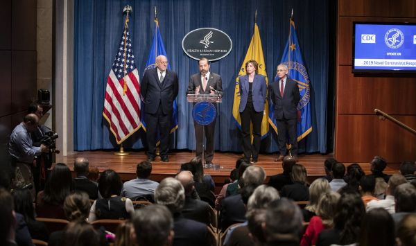 美国卫生与公众服务部(HHS)部长亚历克斯·阿扎(左二)1月举行新闻发布会,谈公共卫生应对措施。(美国《纽约时报》网站)