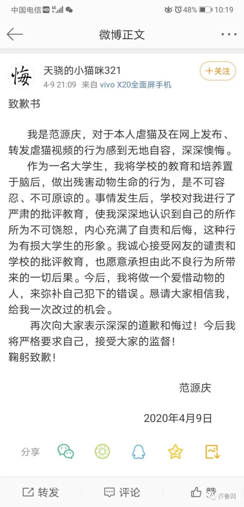 我是范源庆,对于本人虐猫及在网上发布、转发虐猫视频的行为感到无地自容,深深懊悔。