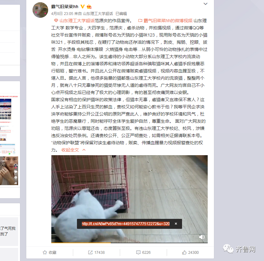 4月9日上午11点52分,@霸气旧菜菜hh博主再次发文:“事件的起因是网友在微博上发现了一个贩卖虐杀猫视频的用户,其收款账户与卖片的网盘属于贵校数学专业的大四的名为范某的同学。此用户最开始较为大胆,直接在天骁的小猫咪123自我介绍区写了“虐猫视频,原创视频,需要私聊”,经常去微博动物保护相关超话或者潍坊领养超话发血腥虐杀猫的视频挑衅。