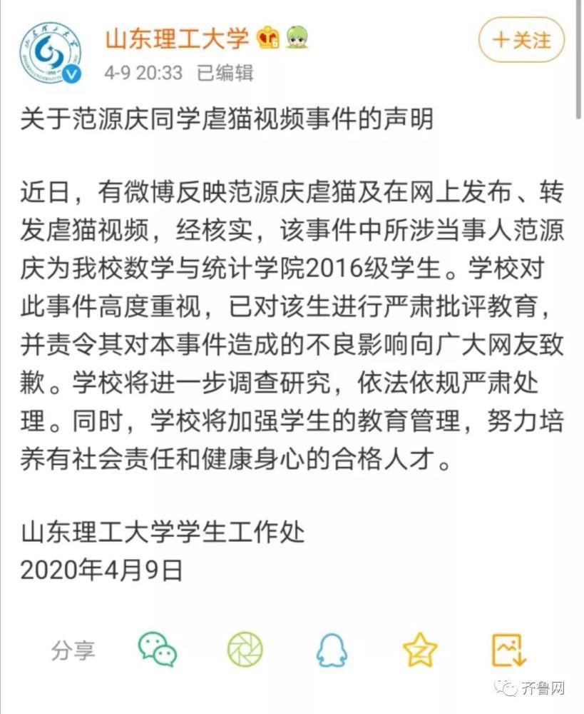 9日晚,山东理工大学官方发布“关于范源庆同学虐猫视频事件的声明”: