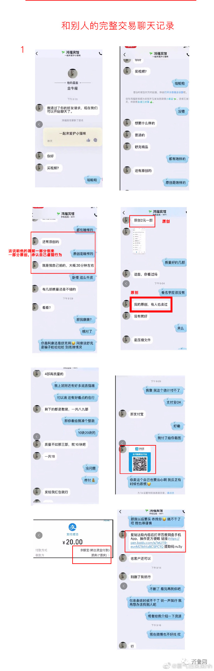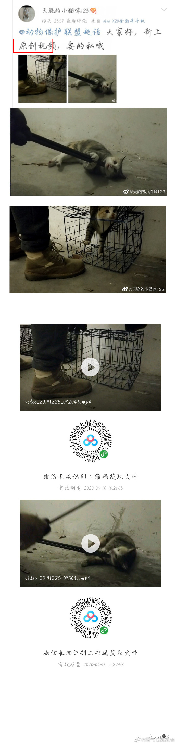 网友加其qq后得知他不仅贩卖虐杀猫的视频,而且亲自制作大量虐杀视频,其猫部分直接来自他在大学里捕捉的猫,其百度帐号关注了很多收养猫的贴吧并询问过在哪可以买猫。记者扫描图中所留百度网盘小程序发现,其中一个仍保留有视频,视频中显示有猫被关在笼子中。另一个二维码则显示内容违规已被删除。