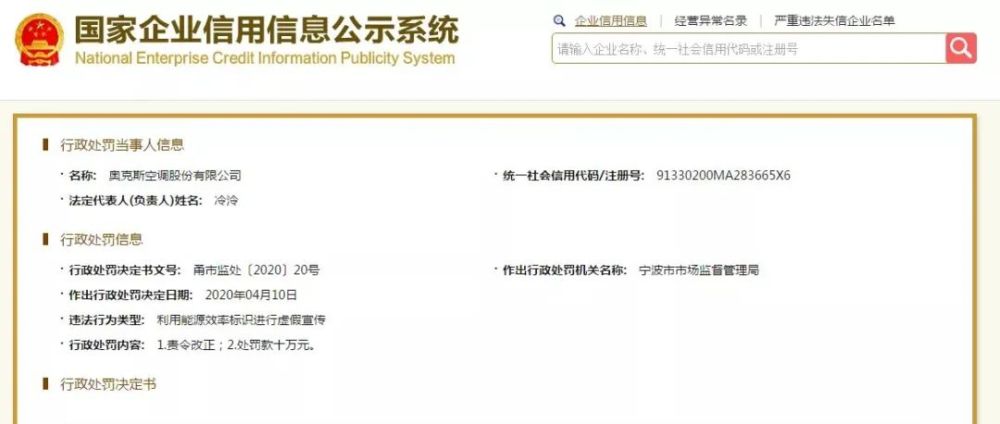 中新社国是直通车记者10日从中国国家企业信用信息公示系统获悉,浙江省宁波市市场监督管理局今日对奥克斯空调股份有限公司利用能源效率标识进行虚假宣传一案,作出“责令改正”和“处罚款十万元人民币”的行政处罚决定。