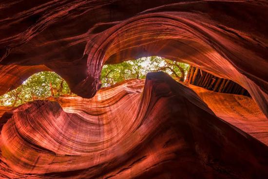 成片的胡杨树叶在秋阳里婆娑起舞,在秋风里翻滚鲜亮的色彩。漫步于这浓郁的胡杨林中,仿佛进入童话般色彩斑斓的梦境。