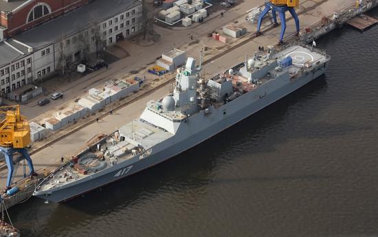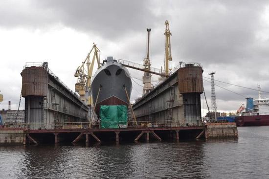 据俄罗斯圣彼得堡北方造船厂披露的消息,在该船厂建造中的22350型护卫舰3号舰“戈洛夫科海军上将”号(船厂编号923)已于3月底从船台转移至了浮船坞中,包括装有四面5П-20К“涂金胶料”(Poliment)相控阵雷达的塔式桅杆也已吊装完毕,预计4月底或5月初正式出坞下水。