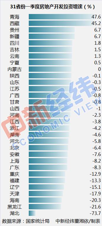 中新经纬客户端注意到,从同比增速来看,一季度有22个省份增速超过全国平均水平(-7.7%),其中仅青海、西藏、贵州、新疆、四川、吉林、云南、宁夏8个省份实现正增长,青海以47.6%的投资增速领跑全国。此外,黑龙江、海南等22个省份增速为负。在疫情严重的湖北,一季度房地产开发投资增速下滑73.7%。