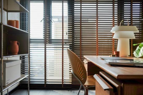 百叶帘也是书房的标配,刺眼的阳光在它面前瞬间变温柔,伴着缕缕光影读书,想想就觉得美好。