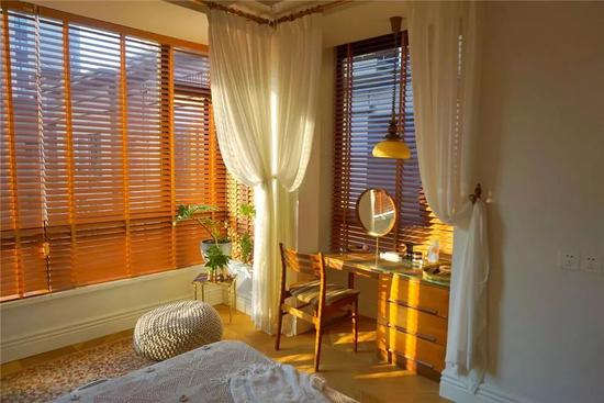 偏爱复古风的屋主请叫我睡不够,在卧室就用了木色的百叶帘,阳光好的时候,就可以穿越了。