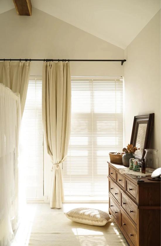 如果担心百叶帘的遮光度不够,你可以像屋主兰奕一样,再挂一层棉麻薄窗帘,靠外的是斑驳光影,靠内的全遮光,还能起到装饰作用。