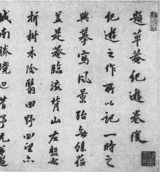 《草庵纪游图》卷后题跋中各人的题诗均与沈周的题诗和韵,因此所有题诗的最后一字均为“浪”。弘治十六年(1503),正在草庵小住的憧南得观此卷,看到“品题盈卷,群公珠璧烂然”,不禁感叹韵脚难和,但他还是硬着头皮写下题诗,并同样以“浪”字结尾保持队型。