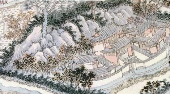 为表现悳茂的僧房,沈周特地在画中佛殿旁的院落里描绘了一个和尚的形象。另一个小僧正在院外的桥头迎接着即将过桥而来的“沈周”。就这样,悳茂与沈周“同框”了。